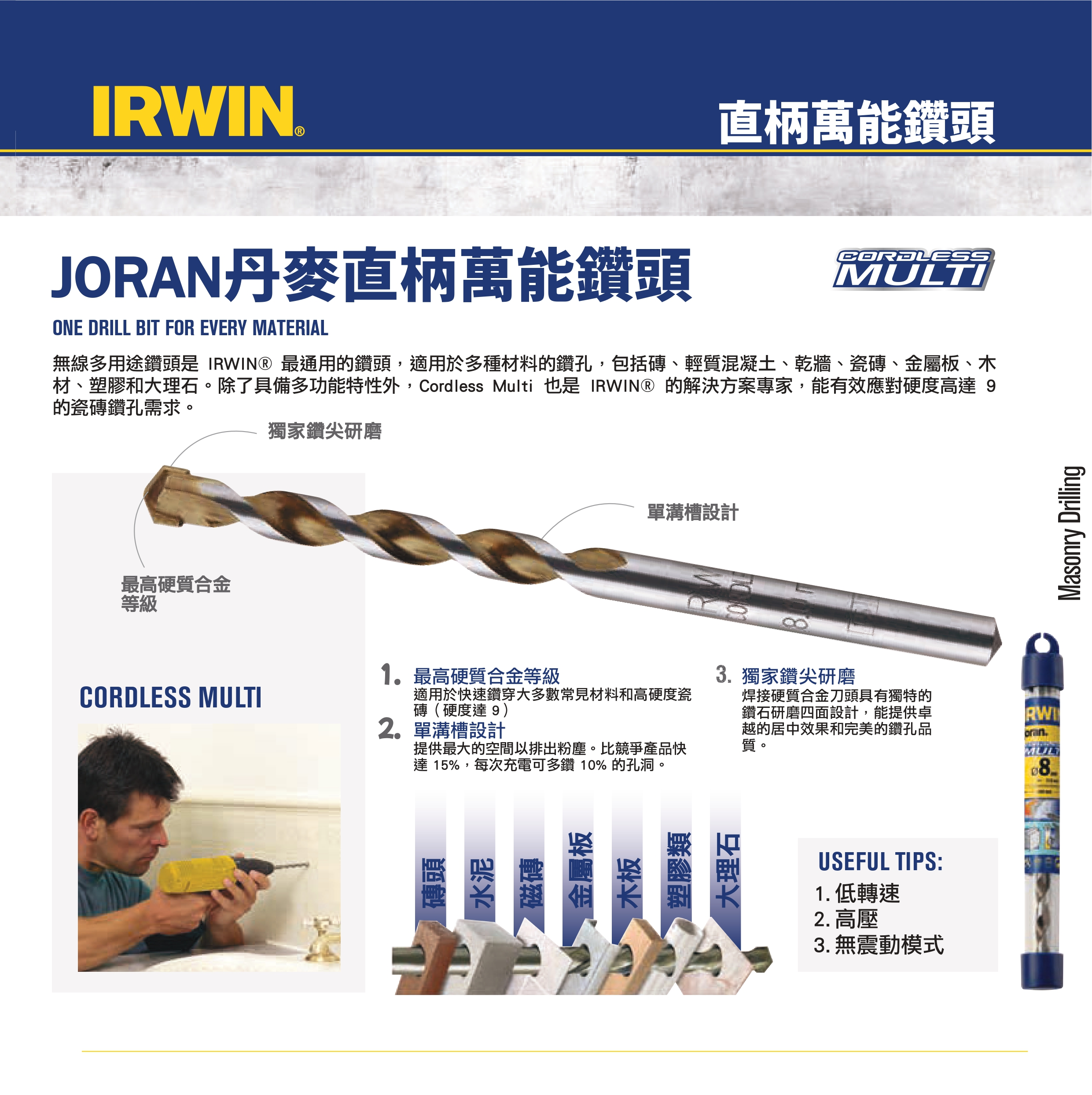 JORAN® 丹麥直柄多用途萬能鑽頭是 IRWIN® 最通用的鑽頭。它設計用於在各種材料上鑽孔,包括磚、輕質混凝土、乾牆、瓷磚、金屬板、木材、塑膠和大理石。除了多功能功能外,萬能鑽頭也是 IRWIN® 問題解決者,用於在硬度高達 9 的瓷磚上鑽孔。
