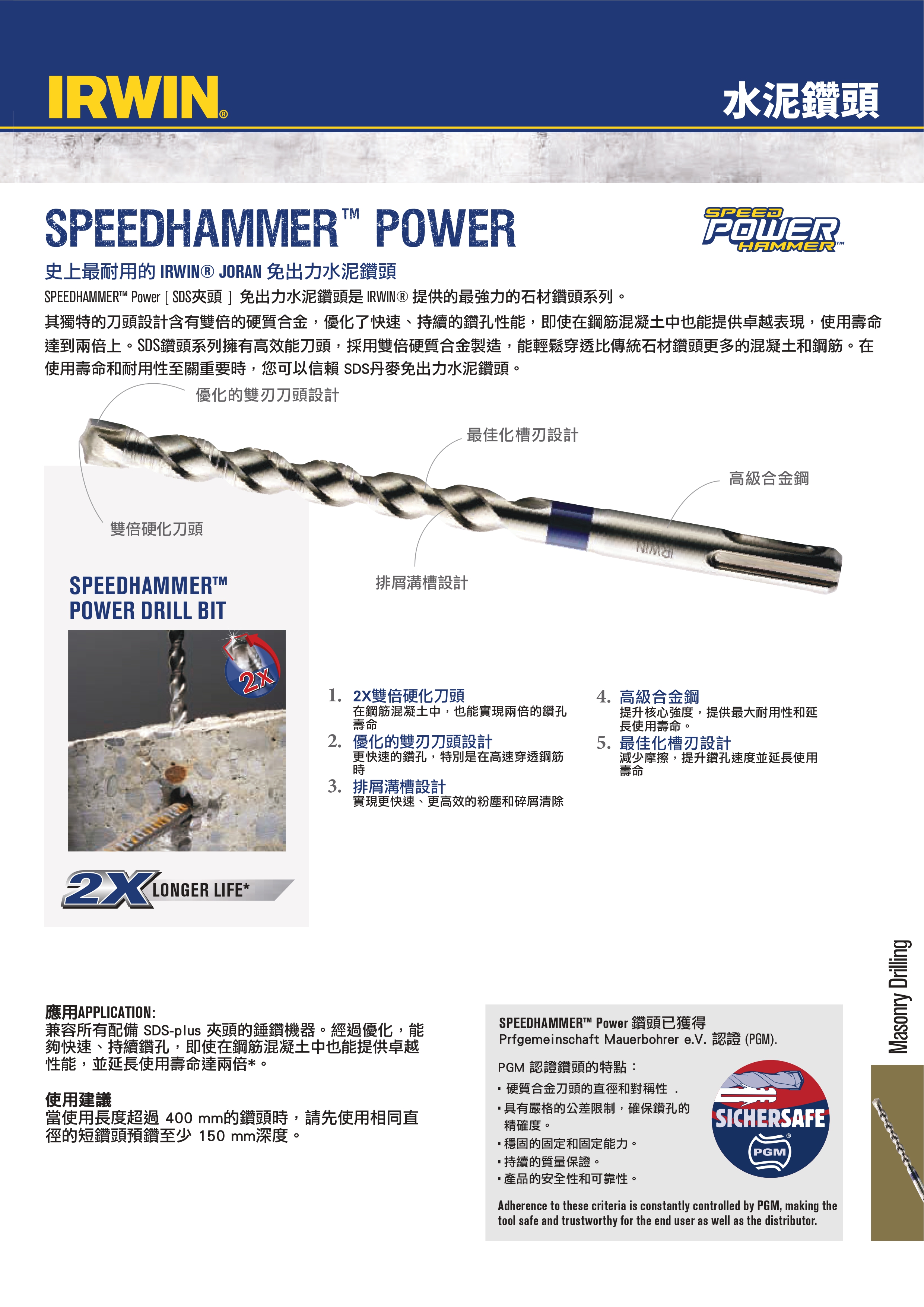 SPEEDHAMMER™ Power 免出力水泥鑽頭是 IRWIN® 提供的最強力的石材鑽頭系列。